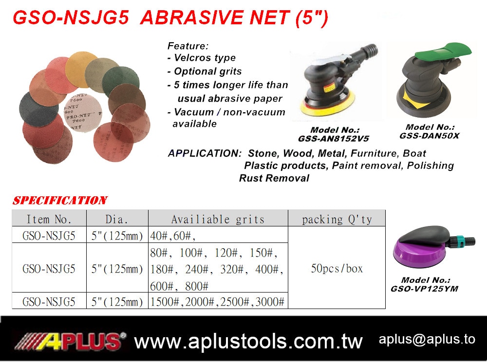 | GSO-NSJG5 | 5" (125mm) | 40, 60, 80, 100, 120, 150, 180, 240,320 400, 600, 800, 1500, 2000, 2500,3000 | 50PCS/BOX 36BOXES/CTN |
