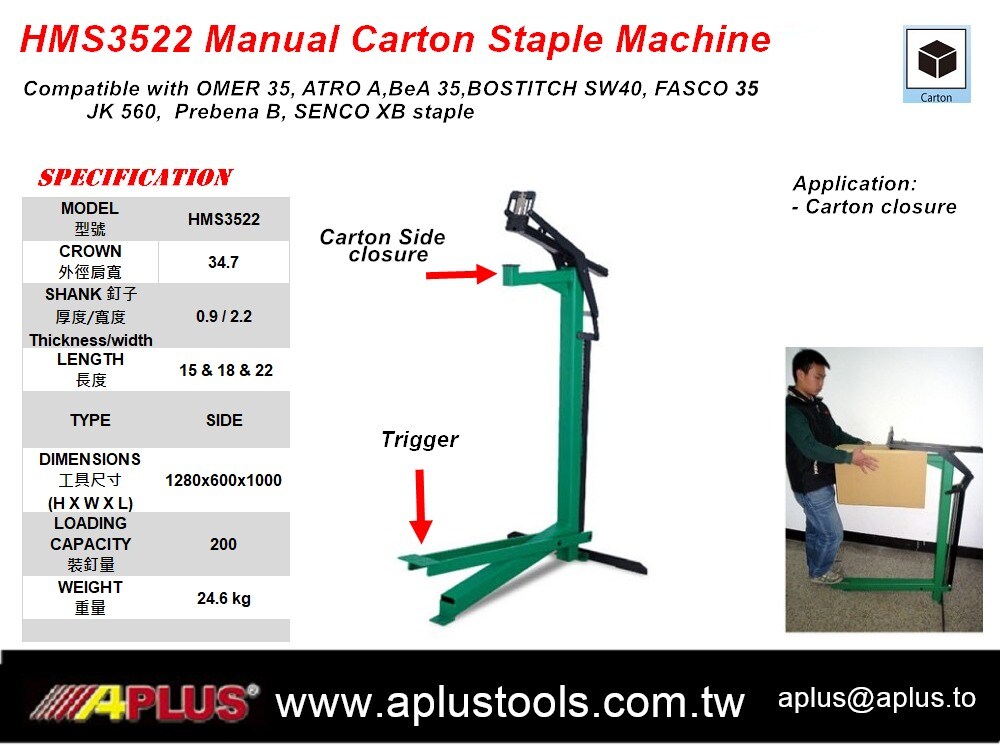 APLUS HMS3522 SIDE MANUAL CARTON STAPLE MACHINE 34.8MM CROWN, CONTROL BY FOOT